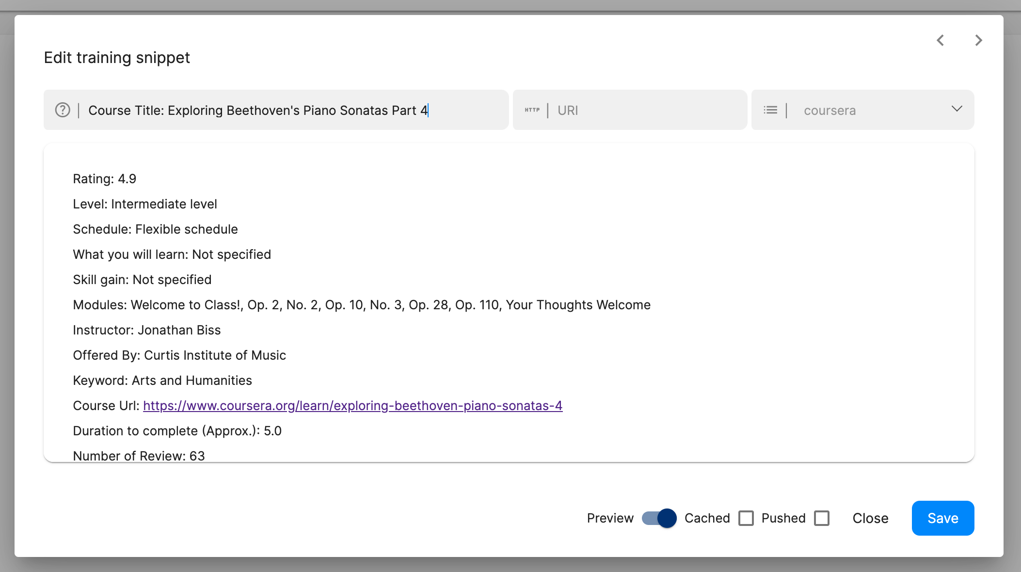 In the video below I import a data set I found for coursera courses. The original file contains 8,000+ records, which is easy for us to deal with - But to keep the video short, I only imported 11 records. However, imagine having an AI chatbot you could ask questions such as.